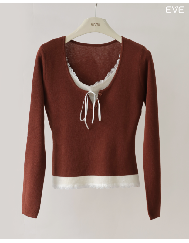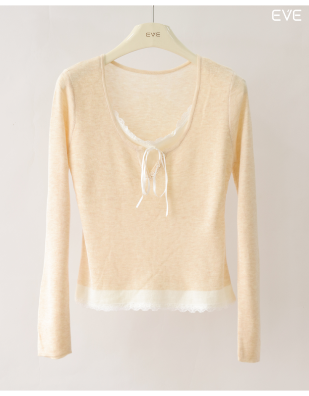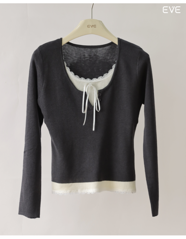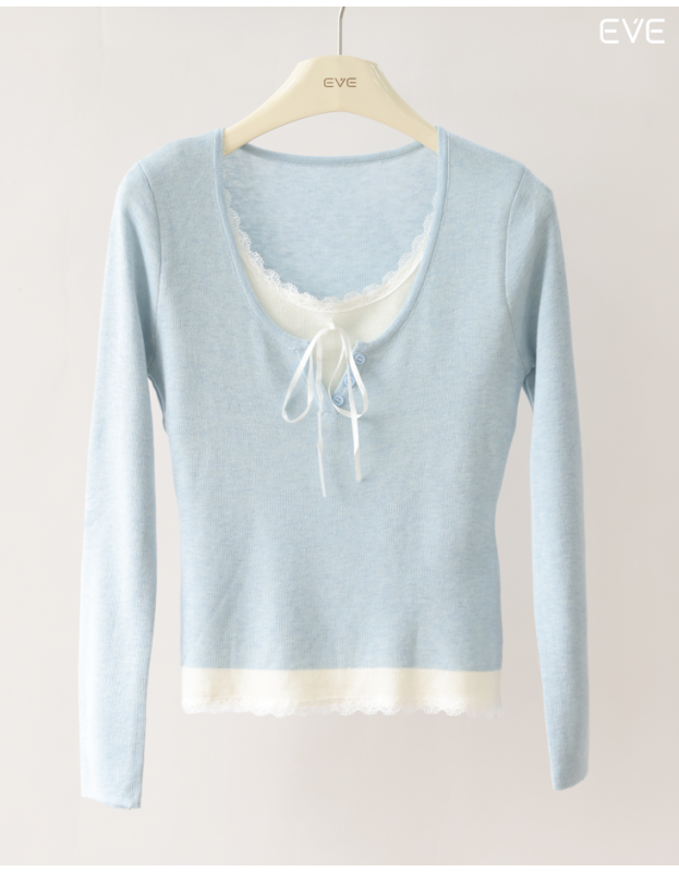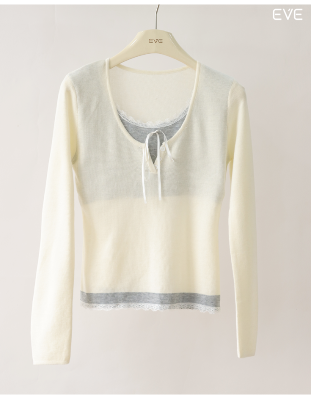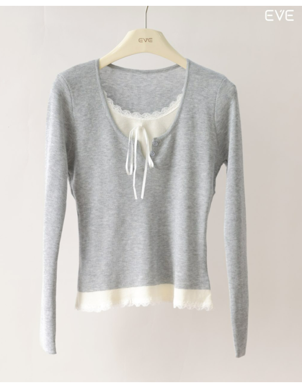 Embrace delicate detail with the EVE Layered Lace Knit Top, a beautifully styled piece that offers a pre-layered look. This soft, fine-knit top features a flattering scoop neckline and a contrast color band at the hem finished with feminine lace trim. The neckline is detailed with a subtle tie-front and mimics a tank top layered beneath, enhancing its sweet, romantic charm. Available in a variety of soft and versatile colors, including a pastel blue, warm beige, and classic gray, this long-sleeve knit is perfect for adding a touch of delicate style to your everyday outfits.