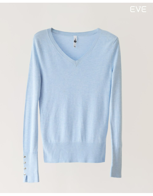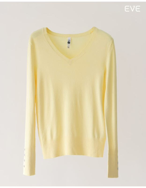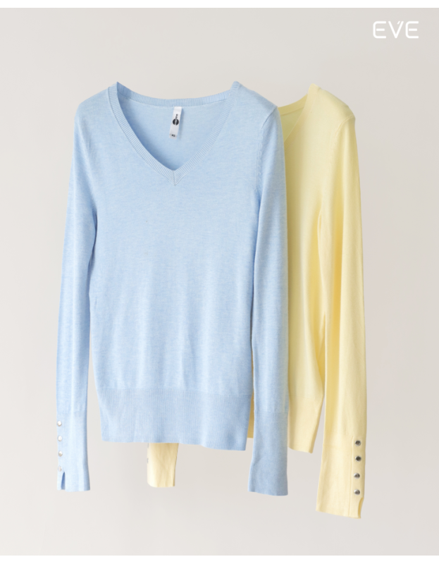 The V-Neck Sweater is the perfect lightweight knit for sophisticated, effortless style. This sweater features a flattering V-neckline and a slim, versatile silhouette. The subtle shine and smooth texture of the fine knit fabric make it ideal for year-round wear or layering. The standout detail is the elegant long sleeves, which are finished with a split cuff adorned with chic, functional silver-toned buttons. Available in beautiful pastel colors like soft light blue and cheerful yellow, this sweater is an essential for elevating both casual and smart outfits.