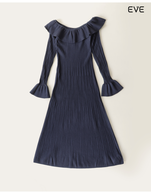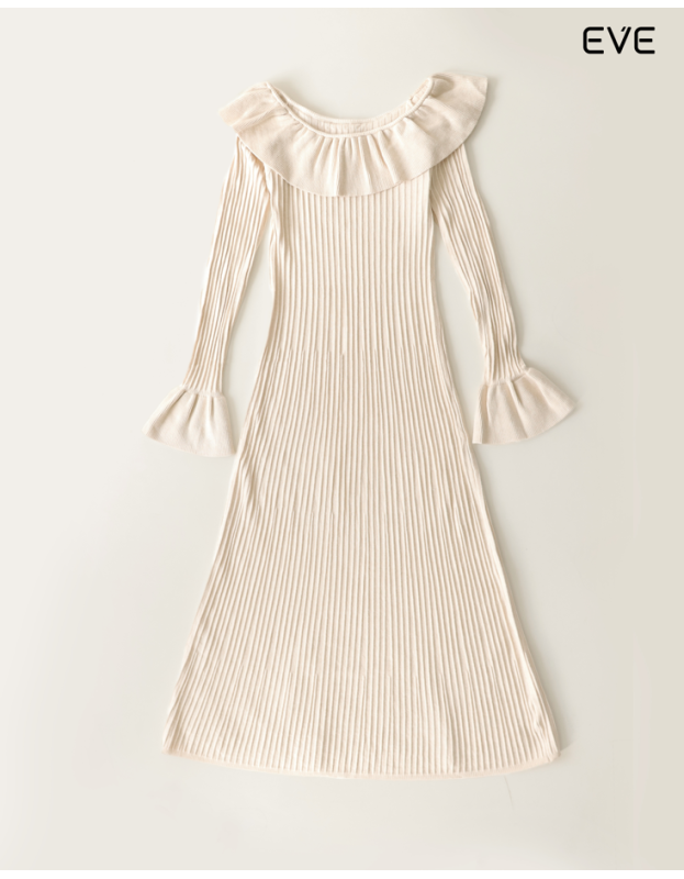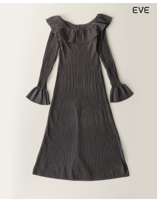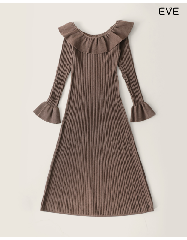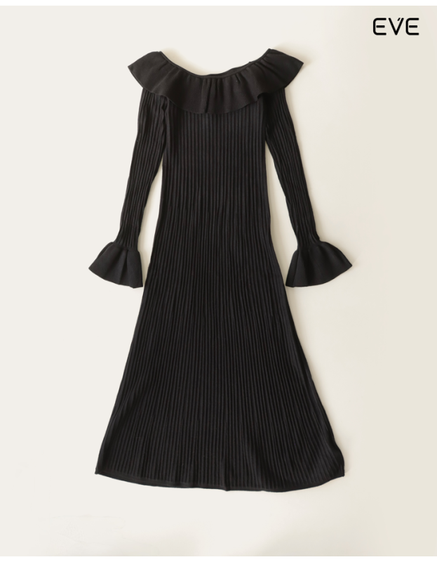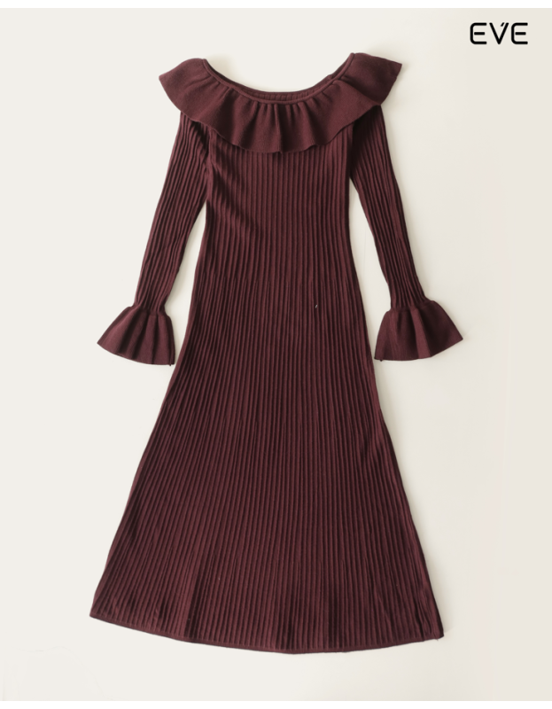 Embrace warmth and sophisticated femininity with the Ribbed Knit Ruffle Dress. This elegant, long-sleeve midi dress is crafted from a soft knit featuring an all-over vertical ribbed texture that provides a flattering, elongating drape. The design is defined by a dramatic off-the-shoulder ruffle neckline and elegant flared/bell cuffs, adding a touch of romance and charm. Available in a rich spectrum of colors—including classic black, deep burgundy, neutral off-white, and sophisticated charcoal gray—this dress is the perfect statement piece for chic, cool-weather style.