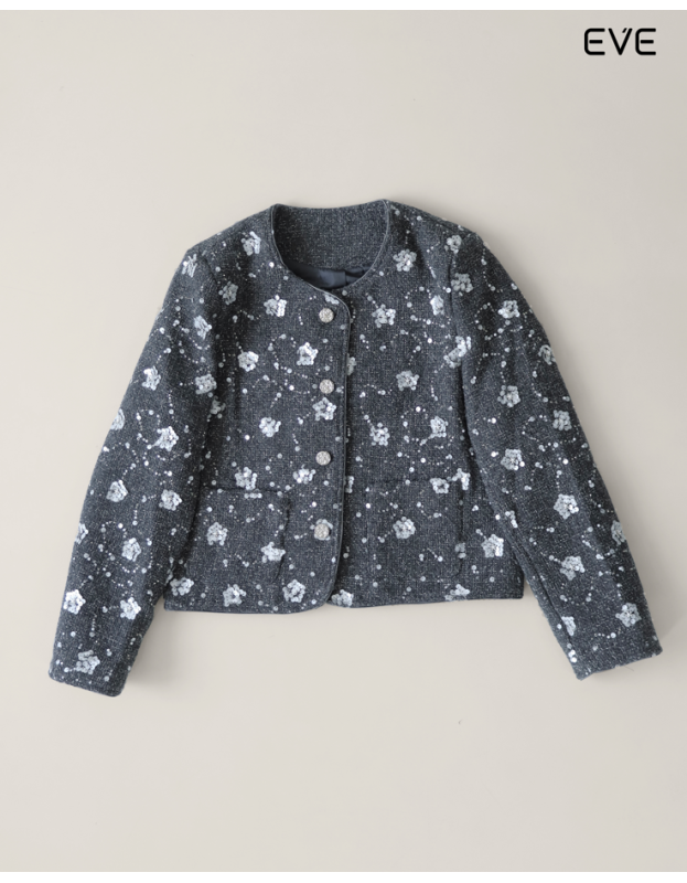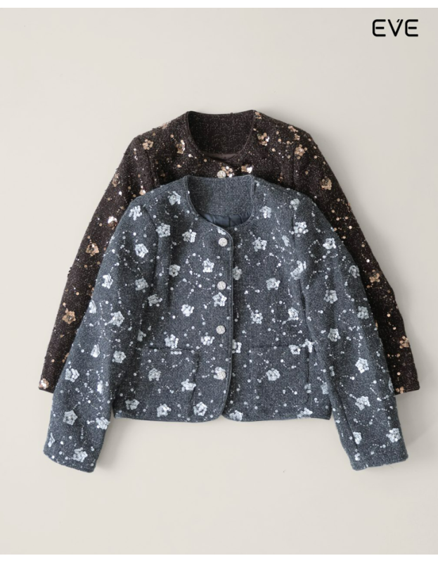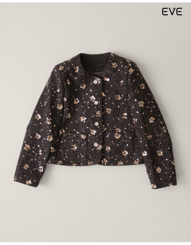 Make a dazzling entrance with the Glitterati Cropped Jacket, the ultimate statement piece for cocktail hours and festive events. This unique jacket combines the classic texture of tweed with playful, all-over sequins that catch the light with every move. It features a chic, collarless crew neckline, a tailored cropped silhouette, and sleek front button closures. The jacket is available in a sophisticated Charcoal Grey tweed with scattered white and silver sequins, and a rich Dark Brown tweed with warm gold sequins, offering two luxurious options to elevate your evening or holiday look. Shine bright this season with EVE.